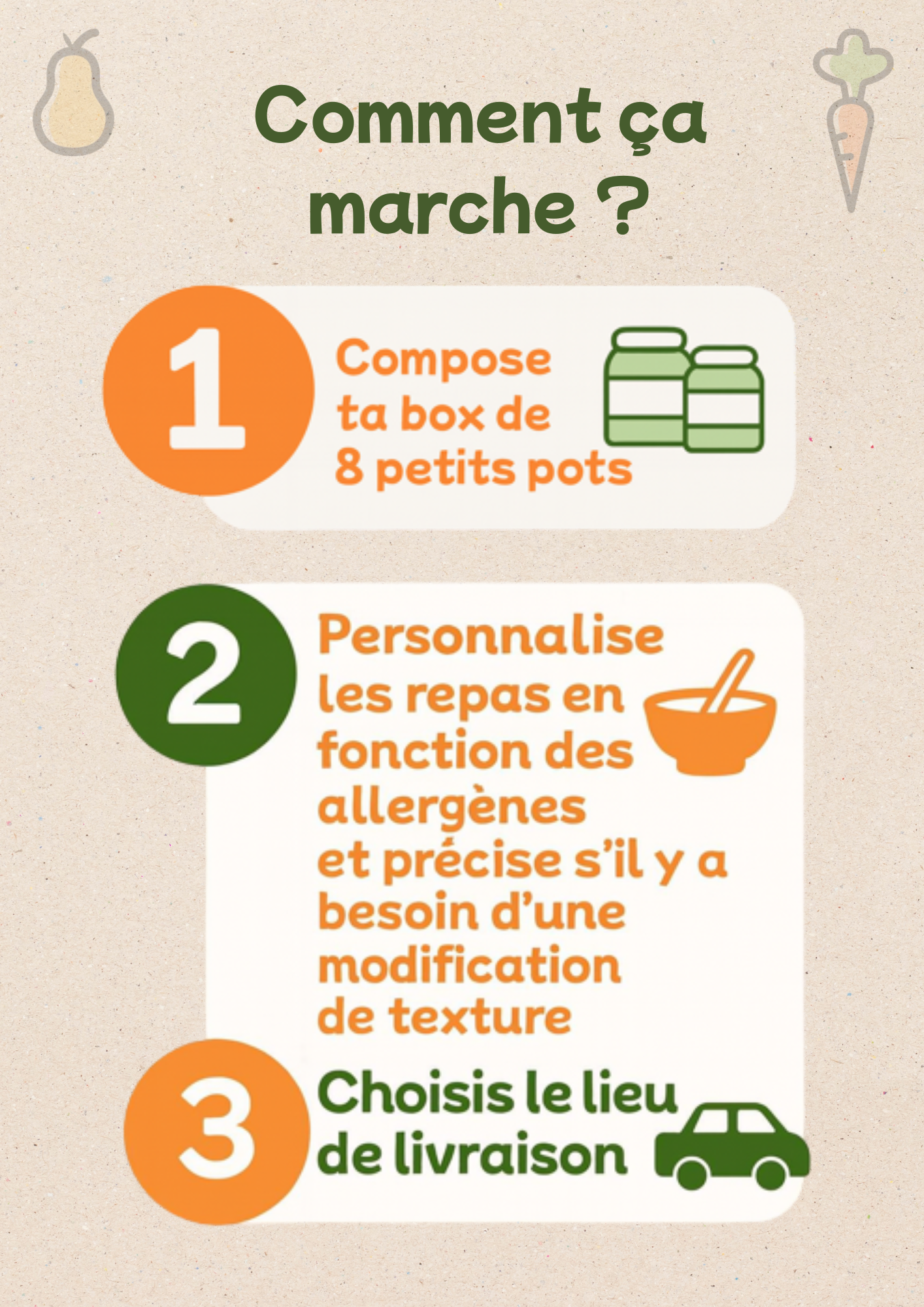 Recevez votre box de petits pots préférés sans effort grâce à notre service de livraison directement au travail ou chez votre nounou. Facile et délicieux !